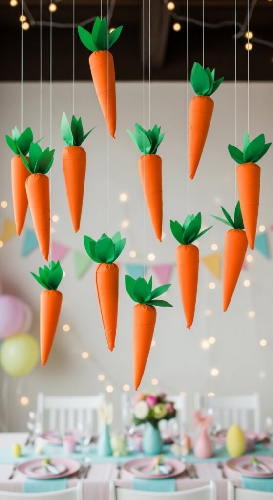 Hanging carrot decorations add vertical interest to any party setup. Make paper or fabric carrots in various sizes. Attach clear fishing line or thin ribbon to each one. Hang at different lengths from a ceiling beam, curtain rod, or tension wire. The varying heights create a whimsical floating effect. Great for baby showers, Easter parties, or spring classroom events. Make 20 for under $5 using colored cardstock and basic craft supplies from any dollar store.
