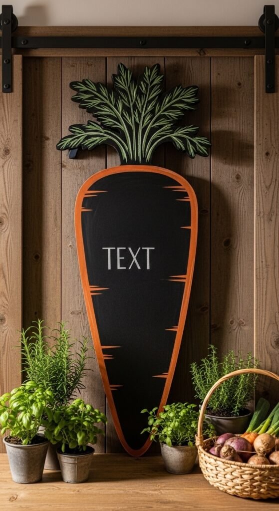 Cut a carrot silhouette from thin plywood or MDF. Paint it with chalkboard paint. Write seasonal messages, menus, or grocery lists on it. Hang it in a kitchen, mudroom, or entryway. It works as both a functional sign and a playful decoration year-round. The shape makes it a conversation starter. Find the chalkboard paint at any hardware store for around $6 a can. One can covers multiple projects. Wipe clean and rewrite anytime.