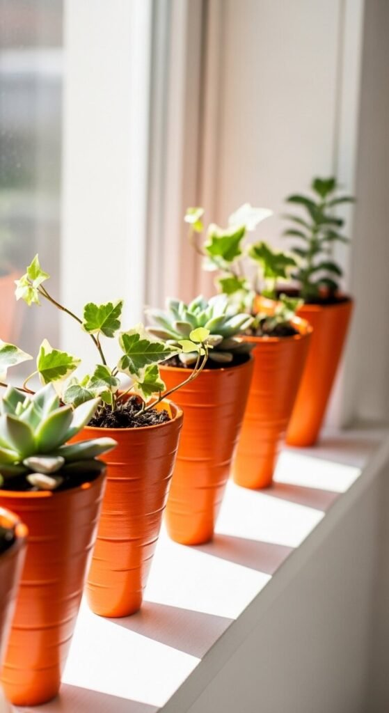 Turn carrot-shaped containers into mini planters for a fun windowsill display. Use orange painted cones made from plastic cups or cardstock. Place a small plastic pot inside to hold the actual plant. Tuck succulents, herbs, or trailing plants into each one. Line them up on a windowsill or kitchen shelf. The combination of living plants with the carrot shape is incredibly charming. Cost depends on what plants you choose, but the carrot containers themselves cost almost nothing.