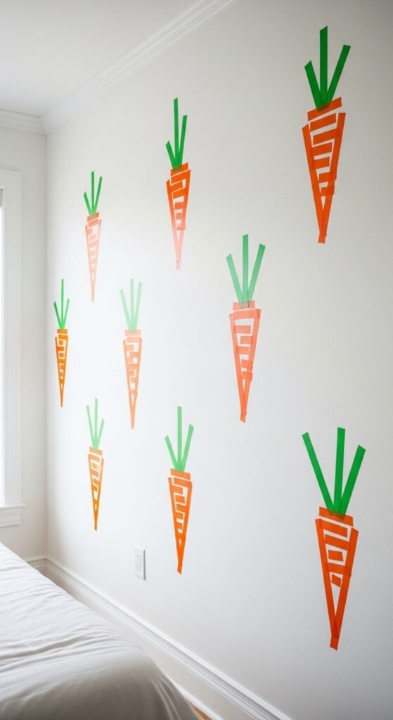 Washi tape is one of the most renter-friendly decorating tools around. Use orange washi tape to form long carrot triangles on a wall. Add green tape strips at the top for the leaf effect. Peel off without leaving marks when done. Create a pattern of repeating carrots across a feature wall or just one oversized statement carrot. This works beautifully in a kid’s room or a playful hallway. A few rolls of tape costs around $3–$5 total.