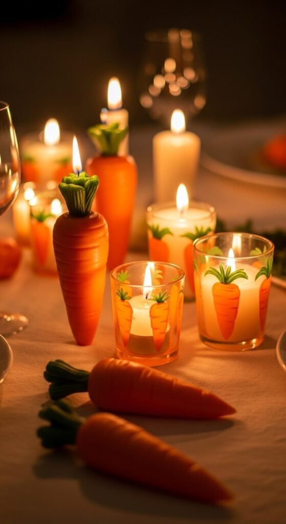 Carrot candle holders bring a cozy, warm glow to spring evenings. Paint plain glass votives orange. Add green painted details near the top rim. Place a tea light or small candle inside. Group several together on a tray for a centerpiece. Alternatively, pour your own orange-tinted wax into carrot molds for full DIY candles. Silicone carrot molds are affordable online. They make great gifts too. The candlelight through the orange glass creates a beautiful warm effect.