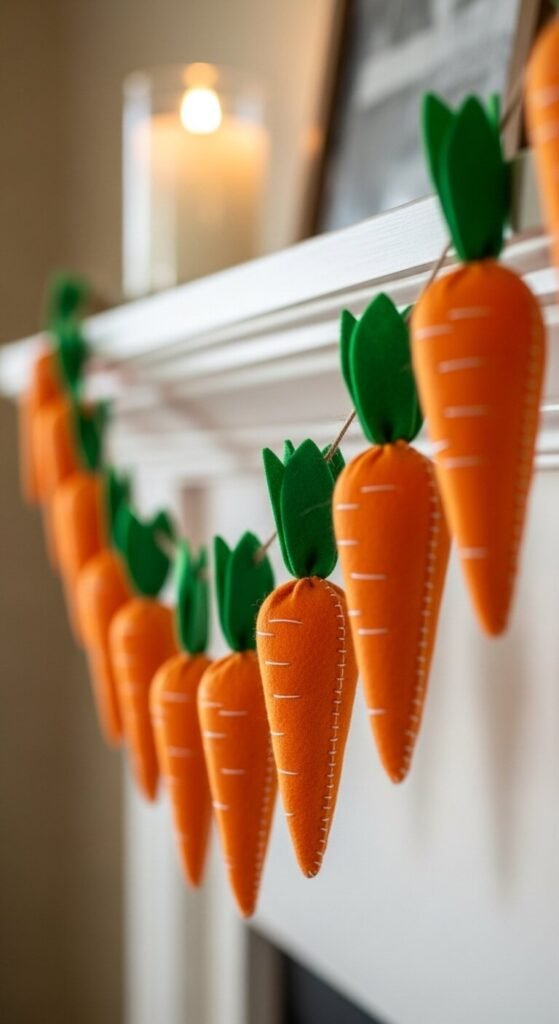 A felt carrot garland is one of the easiest DIY projects you can make. Cut orange felt into cone shapes. Stitch or glue them together. Add green felt strips for the tops. String them on twine or ribbon. Hang across a mantle, window, or bookshelf. You can make a whole garland for under $5 in materials. It’s reusable year after year. Kids love helping cut and stuff the carrots. Simple, cheerful, and totally charming.