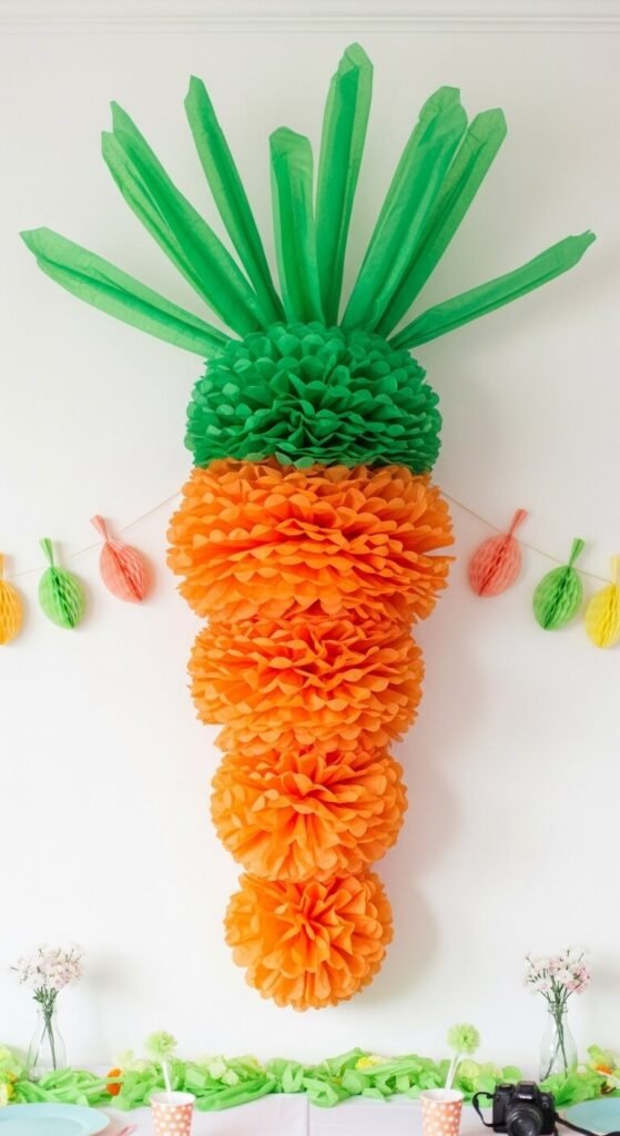 Tissue paper pom-poms are a party staple, and they’re even better in carrot form. Stack orange tissue sheets, fold accordion-style, and fan them out into a pom. Use green poms at the top to suggest carrot leaves. Mount them on a wall or doorway in a cluster to create a giant carrot installation. It’s a perfect photo backdrop for a spring party. One set of pom-poms takes about 15 minutes and costs under $2 per pom using dollar store tissue paper.