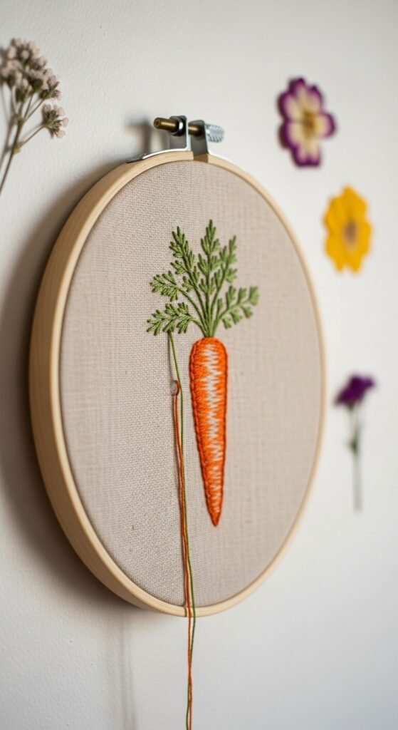 Embroidery hoop art with a carrot motif is a quiet, handmade decoration with real charm. Stretch cream or white linen in a hoop. Stitch a simple carrot shape using orange and green thread. Use basic stitches — satin stitch for the body, backstitch for the outline. Hang it on a gallery wall or prop it on a shelf. Beginner-friendly patterns are free online. A starter embroidery kit costs around $5–$8. The finished piece looks handcrafted and personal in the best possible way.