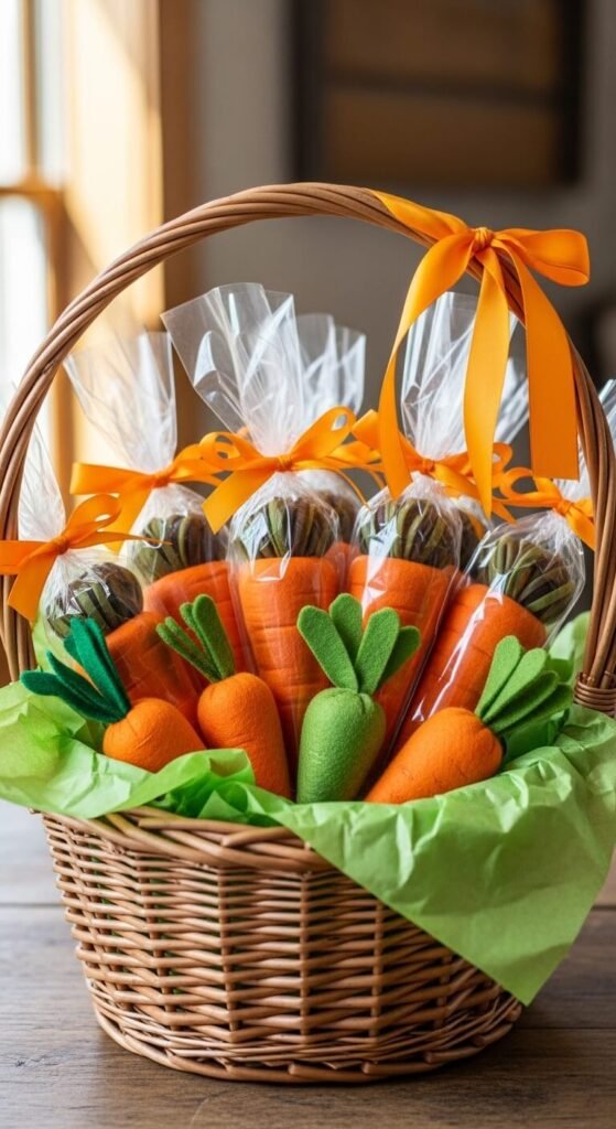 A carrot-themed gift basket works as both a decoration and a present. Fill a wicker basket with orange items: wrapped candies, a small stuffed carrot, green tissue paper, and a few real carrots for fun. Tie orange and green ribbon around the handle. Display it on a table, console, or counter as a centerpiece. When you’re done with the event, gift it to someone. It doubles as decor and a gesture of generosity. Budget anywhere from $5 to $20 depending on what you fill it with.