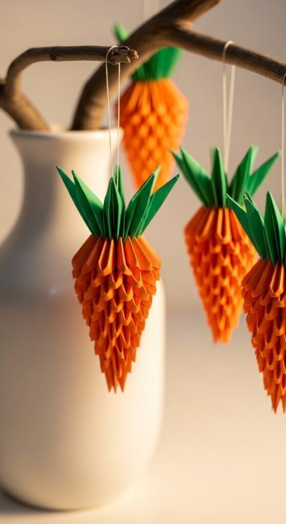 Origami carrots are a surprisingly elegant decoration. Fold orange square paper into a cone shape. Tuck green folded paper strips into the top. Hang them from string on a branch vase for a modern, minimal look. You can also scatter them across a tabletop as confetti-style decor. Free origami tutorials are everywhere online. All you need is colored paper, which costs almost nothing. Make a batch of 12 in an afternoon. They photograph beautifully for social media too.