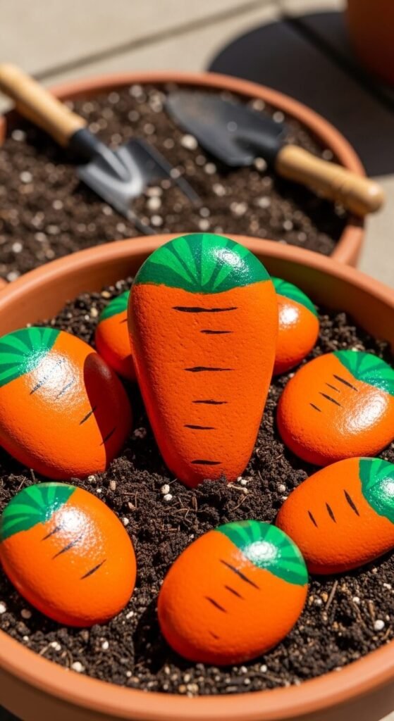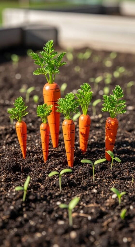 Garden marker stakes shaped like carrots are practical AND decorative. Cut small carrot silhouettes from thin wood or thick cardboard. Paint them orange with green tops. Write plant names on the back with a waterproof marker. Push them into soil to label your herb or vegetable garden. They make your garden beds look intentional and sweet. Protect with a clear waterproof sealant for outdoor use. These also make wonderful gifts for gardeners. Cost to make a full set? Around $3–$5.