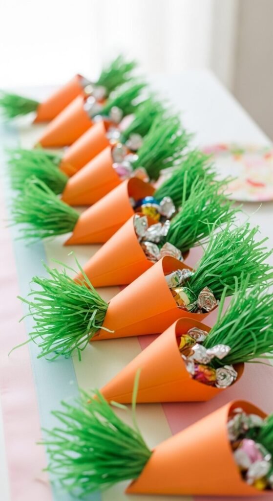 These tiny carrot cones double as decorations and gifts. Roll orange cardstock into a cone. Tuck green crinkle paper or ribbon into the top. Fill with small candies, stickers, or trinkets. Place them along a table runner or in a basket as a centerpiece. They’re perfect for Easter parties or spring birthdays. You can make a dozen for just a few dollars. They look professional and polished without much effort at all.
