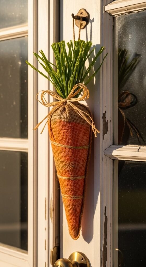 A burlap carrot door hanger gives your front entry serious seasonal charm. Cut burlap into a carrot shape and sew it together. Stuff lightly with polyfill for dimension. Paint it orange. Add raffia or green ribbon to the top for the leafy look. Hang it on your front door with a rustic hook or wreath hanger. It weathers well outdoors and looks adorable from the street. Cost to make? About $4–$6 total.