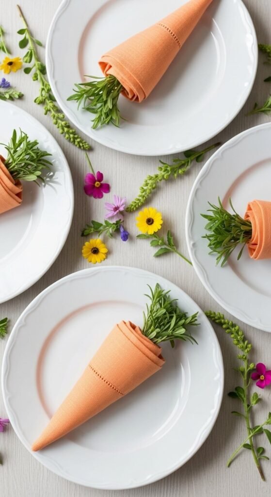 This is a zero-cost decoration if you already have orange napkins. Fold cloth or paper napkins into a cone shape. Roll green napkins or paper to tuck in at the top. Stand them upright in glasses or lay them flat on plates. It transforms an ordinary table into something festive in minutes. No sewing, no glue, no special tools. Just fold and go. Great for Easter dinners or spring brunches. Guests will notice immediately.