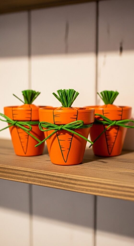 Turn plain terracotta pots into adorable faux carrots. Paint them orange. Tie green jute or raffia around the drainage hole at the bottom — that becomes the “top” of the carrot when you flip it. Display them upside down in a row on a shelf or windowsill. Fill them with small plants or leave them empty as art objects. A set of three costs almost nothing if you already have the pots. Super simple and very cute.