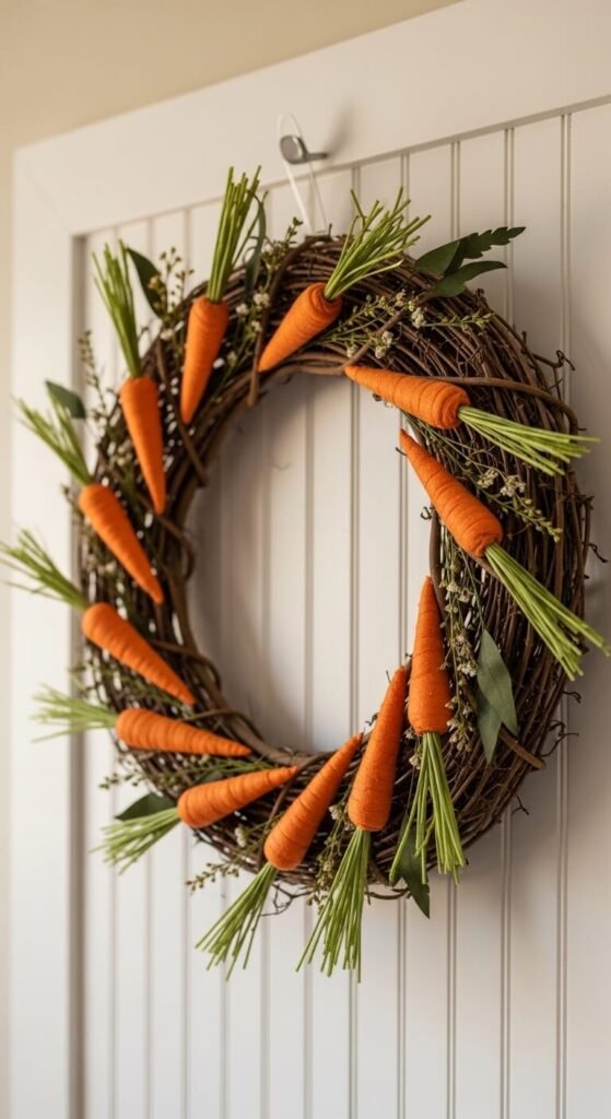 A carrot wreath makes a cheerful statement on any wall or door. Start with a grapevine or wire wreath base. Hot glue small faux or fabric carrots throughout. Tuck in faux greenery, dried flowers, or moss between the carrots. You can find wreath bases at the dollar store. Foam or felt carrots are cheap at craft stores. The whole project can come in under $10 and takes about an hour. Swap it out each season for a fresh look.
