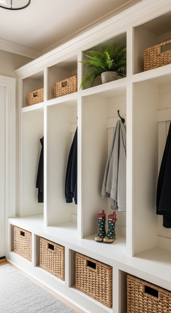 Mudrooms get messy fast. One basket per cubby solves it. Assign each family member their own basket for shoes, hats, or sports gear. Label them if you have kids. Add a small fern on top of the cubby unit for a spring feel without taking up functional space. The baskets keep floor clutter contained in a way that hooks and shelves alone can’t manage. Rectangular baskets with straight sides fit cubbies best. Measure your cubby width before buying so everything fits flush.