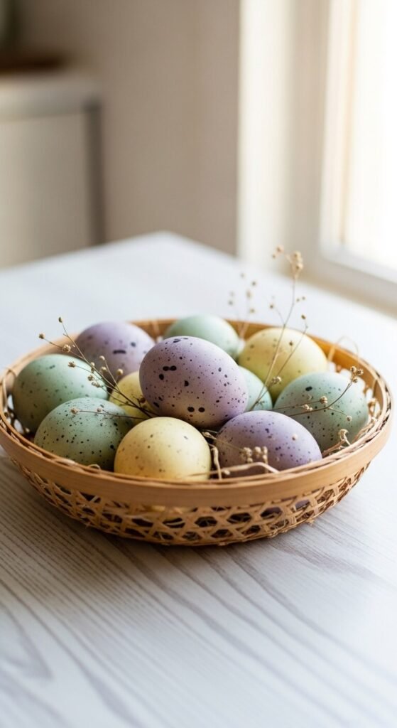 A shallow basket filled with dyed eggs is a classic spring centerpiece. You don’t need real eggs. Craft store plastic eggs painted with chalk paint look just as good. Nestle them in a bed of dried Spanish moss or shredded paper filler. Set it on your coffee table or dining table. It takes about 20 minutes to put together. Kids love helping with this one. Total cost: $5–$8 depending on what you already have at home.