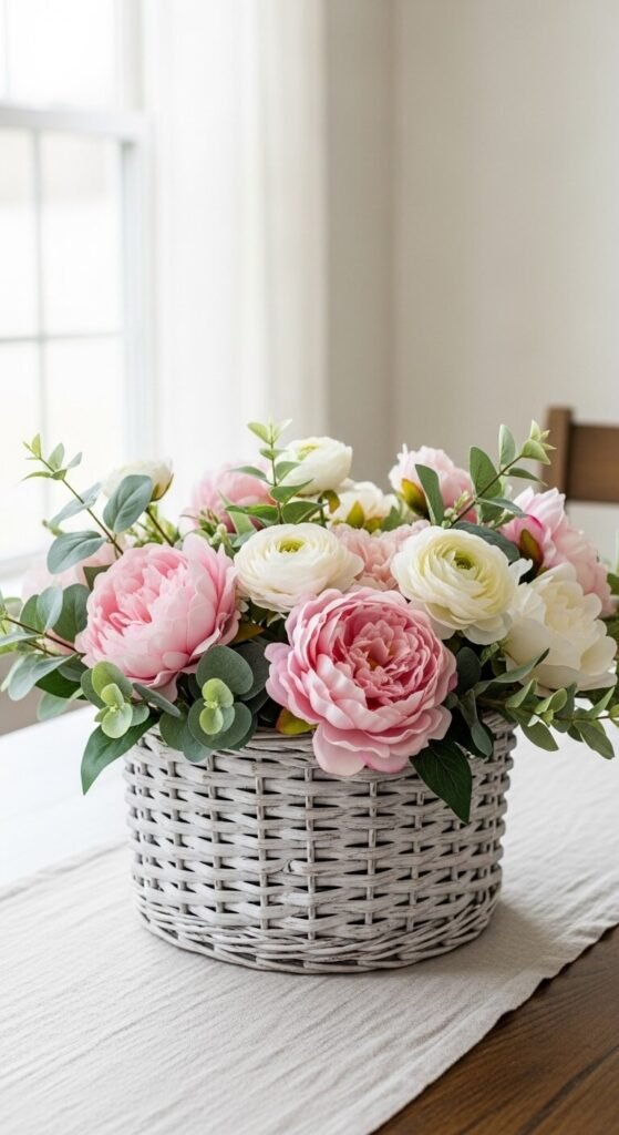 Faux flowers have gotten really good. A whitewashed basket filled with fake peonies and eucalyptus can look just as beautiful as fresh ones. Choose faux blooms in soft, muted tones — blush, cream, and sage. Arrange them loosely so they look natural. Anchor them in floral foam cut to fit the basket. This centerpiece will last all spring without water or maintenance. You can find gorgeous faux stems at craft stores, especially during seasonal sales.