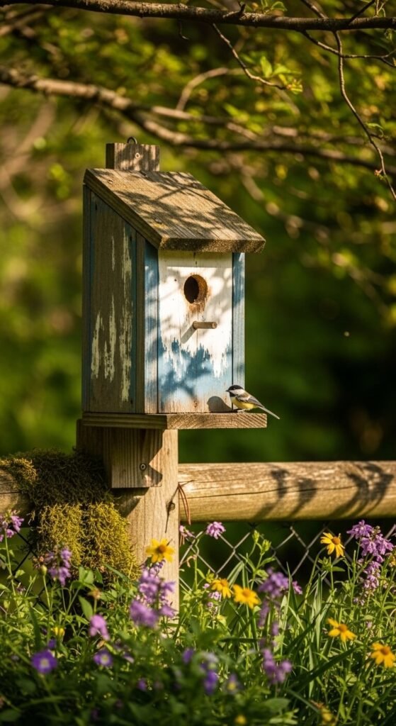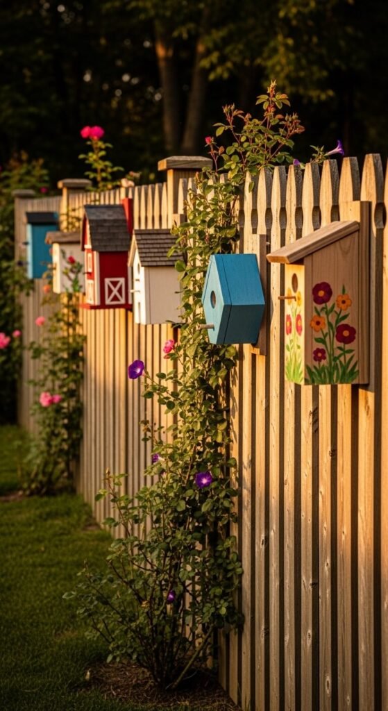 Turn a plain fence into a birdhouse gallery by mounting five or more different-style houses along the pickets at varying heights. Mix and match styles — one barn, one cottage, one simple box — for an eclectic look. Use exterior screws to mount each one securely through the fence. Paint them in a coordinated palette or let each one be completely different for a collected-over-time feel. This works especially well with climbing roses or morning glories trained between houses. The entire fence becomes a wildlife habitat and a decorative focal point all at once.