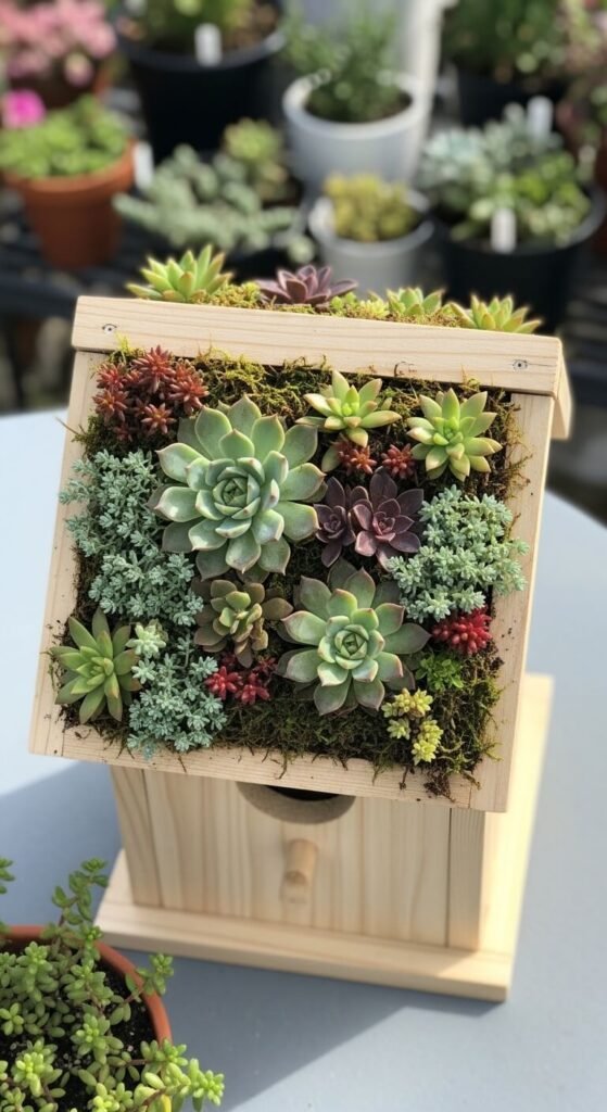 A birdhouse with a living succulent roof is one of the most eye-catching pieces you can put in a garden. Build or buy a simple flat-roofed birdhouse, then add a shallow lip around the top edge to hold soil. Fill it with a thin layer of cactus mix and plant small sedums or echeveria in the gaps. The succulents need almost no water and survive heat well. This style works best as a decorative focal point on a garden table or shelf, raised off the ground. It photographs beautifully and always gets compliments.