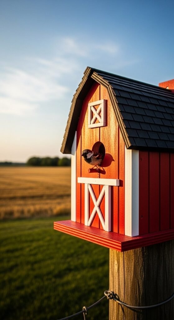 Nothing says classic Americana quite like a red barn birdhouse. Paint a simple wooden box red, add white trim around the edges and entrance hole, and top it with a peaked roof covered in small cedar shingles or corrugated metal scraps. Mount it on a fence post at the edge of a yard for a true farmhouse look. House sparrows and wrens love this style. You can find unpainted barn birdhouse kits at craft stores for under $10. This makes a beautiful gift for anyone who loves country-style garden decor.