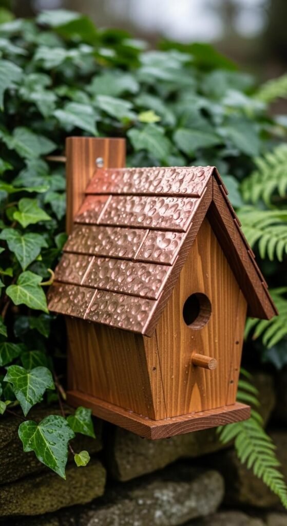 A copper flashing roof takes a simple birdhouse from craft-store quality to something that looks genuinely handmade and high-end. Cut thin copper sheets from a hardware store’s roofing section and bend them over the peak of a wooden birdhouse using pliers. Secure with small copper roofing nails. Over time, the copper weathers to a beautiful verdigris green. Pair it with a walnut-stained wood body for a rich, natural look. This project costs around $10–15 in materials and requires only basic hand tools. It ages more beautifully every season.