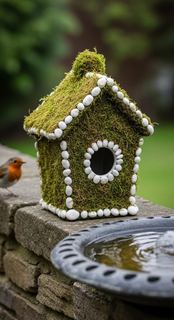 Cover a plain ceramic or wooden birdhouse in dried sheet moss and small pebbles for a look straight out of a fairy garden. Use waterproof outdoor adhesive to press the moss flat against the surface. Press small river pebbles around the entrance hole for a natural frame. This style works beautifully near a birdbath or water feature. The moss stays green in humid climates or can be replaced each spring. Buy a bag of preserved sheet moss at a craft store for about $5. The whole project takes less than an hour.