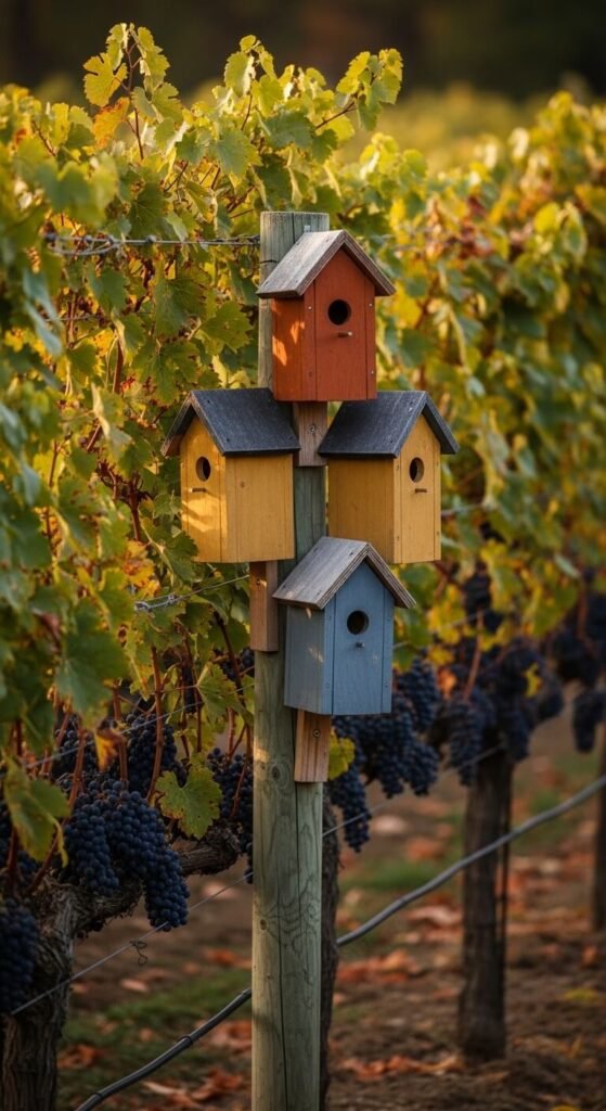 A vineyard-style post birdhouse clusters three or four small houses at different heights on one tall post. Each house can be a different size, color, or style. This arrangement mimics a small bird village and attracts multiple species to your yard at once. Use exterior latex paint in earthy tones like rust, mustard, and slate blue. Space the houses at least 12 inches apart vertically so birds do not compete. Mount the post near flowering shrubs or berry bushes for best results. This project doubles as a striking garden sculpture.