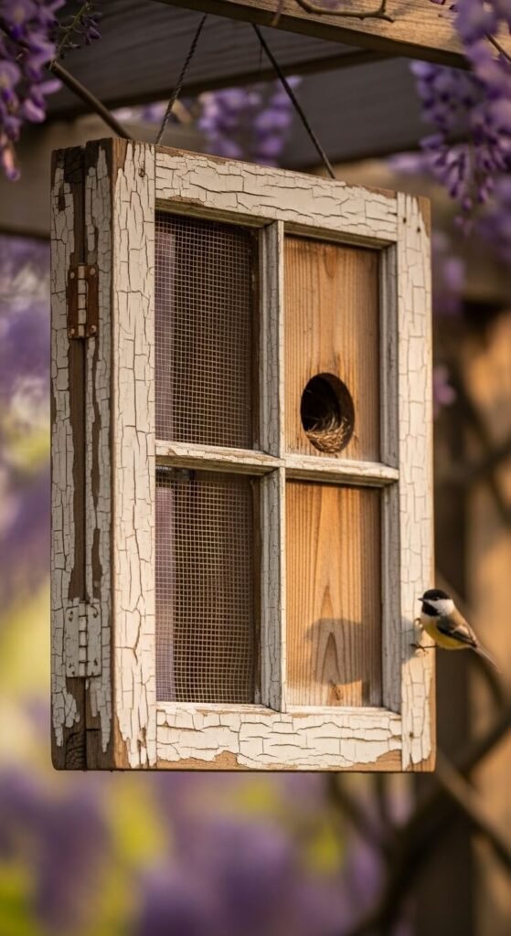 Old window frames from salvage yards or estate sales make stunning birdhouse structures. Remove the glass, build a simple wooden box that fits behind one pane opening, and nail or screw the frame around it. The window frame acts as a decorative border that gives the whole piece an architectural, vintage quality. Hang it on a garden wall or pergola. Leave the chipped and peeling paint — it adds authenticity. This project costs almost nothing if you find the frame for free. Wrens and chickadees will investigate it within days of hanging.
