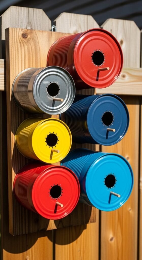 A tin can cluster turns recycled cans into a bold, modern birdhouse installation. Save coffee cans, soup cans, and paint cans over a few weeks. Paint each one a different bright outdoor color — teal, orange, coral, or yellow. Drill an entrance hole in the closed end of each can and mount them in a staggered grid pattern on a painted wooden board. Screw the board flat against a fence or wall. Hang it in a protected spot out of direct rain. Smaller cans attract wrens. Larger ones suit starlings. The whole project costs next to nothing.