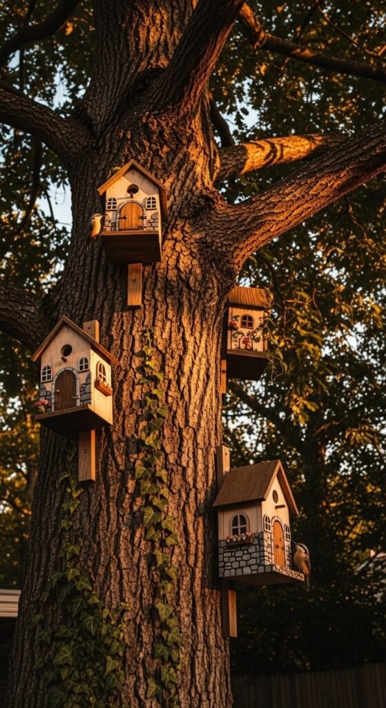 Turn a large backyard tree into a fairy-tale bird village by mounting three or four small birdhouses at different heights along the trunk. Paint each one with whimsical details — arched doorways, flower boxes, tiny shutters. Use acrylic outdoor paint and seal with exterior varnish. This project works especially well in a children’s garden or family backyard. Different height placements attract different species. Make sure each house faces slightly away from direct wind. Wrens, nuthatches, and chickadees will all use natural-looking tree-mounted houses. This is the kind of project that makes a yard feel magical.