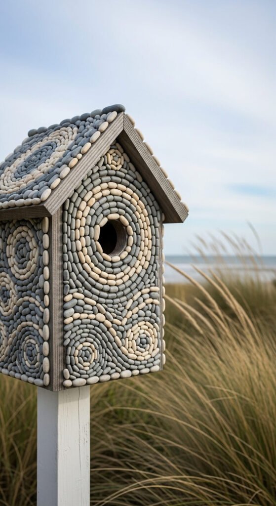 Press small smooth beach pebbles into outdoor tile adhesive to cover a plain wooden birdhouse in a mosaic pattern. Design simple shapes — stripes, waves, or concentric circles. Let the adhesive cure fully before hanging. The pebble coating is surprisingly durable and naturally weather-resistant. Collect pebbles yourself from a local beach or buy a bag from a garden center for about $6. This project takes an afternoon and dries overnight. The finished piece has a heavy, permanent look that holds up well outdoors. It suits coastal, Mediterranean, and natural garden styles equally well.