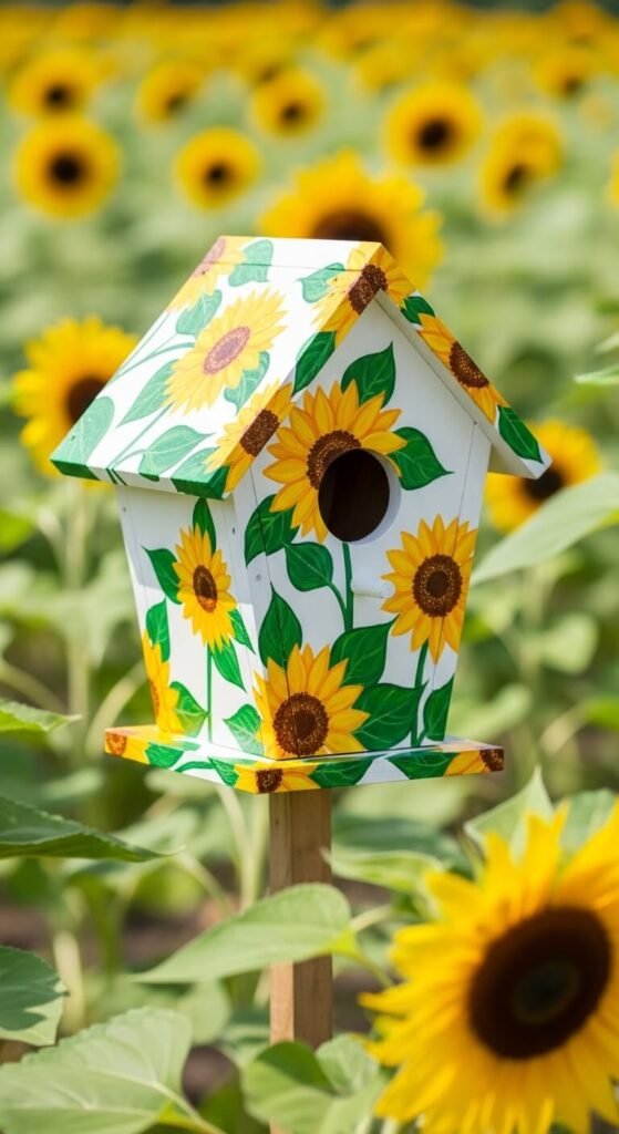 A hand-painted sunflower cottage is one of the easiest decorative birdhouses you can make. Paint the entire house white, let it dry, then use a round brush and yellow outdoor craft paint to add bold sunflower shapes across all four walls and the roof. Add dark brown centers and simple green leaves. No artistic experience needed — loose, imperfect flowers look charming. Seal the whole thing with exterior varnish. Place it in or near a real flower garden so the painted design echoes the surroundings. This makes a beautiful handmade gift for gardeners.