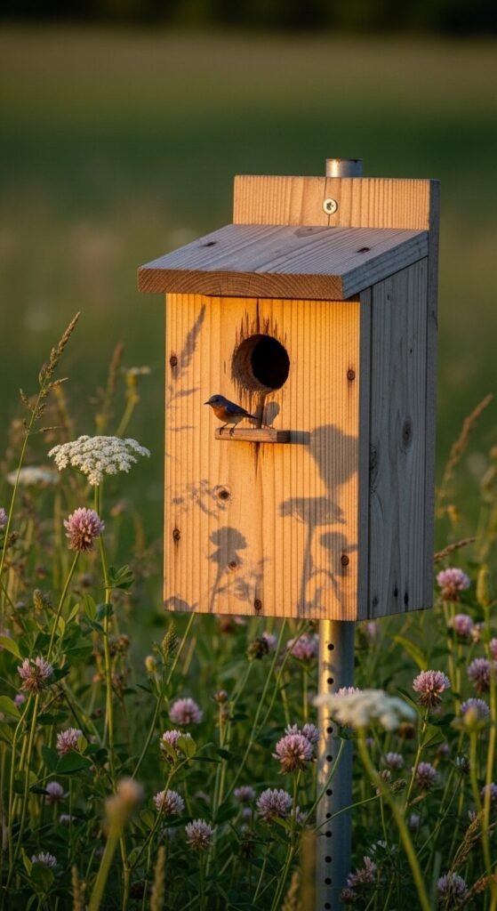 A classic wooden bluebird box is the best starting point for beginners. Cedar or pine works perfectly — both are affordable and weather-resistant. The entrance hole should be 1.5 inches in diameter to keep out starlings. Mount it on a metal pole about five feet off the ground, facing east. Avoid adding a perch — bluebirds do not need one, but predators use them. You can buy a pre-cut kit for under $15 at most hardware stores. Sand the edges smooth and leave the wood untreated for the most natural feel.