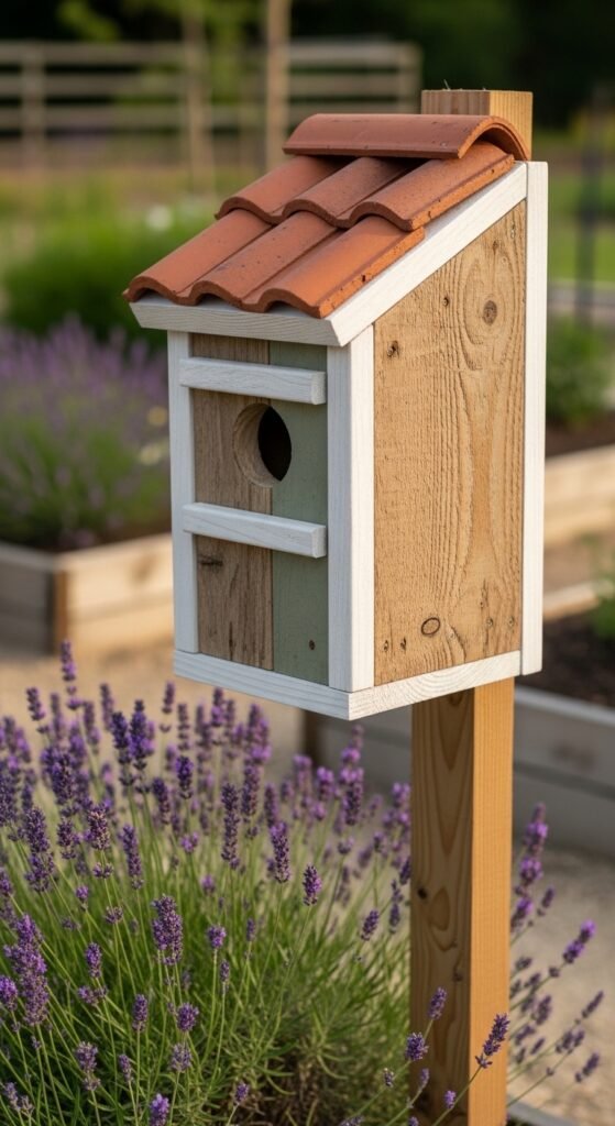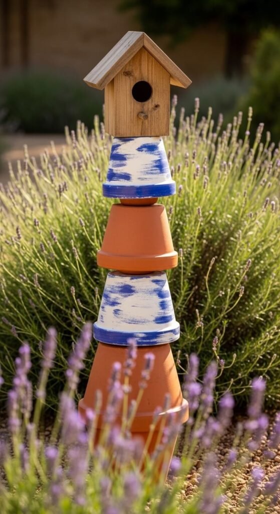 Stack terracotta pots of decreasing sizes on a wooden dowel, invert the top one, cut a hole, and cap it with a small wooden roof. Paint each pot in faded Mediterranean blues, whites, or terracotta reds. This creates a tall, sculptural birdhouse tower that looks like something from a Tuscan garden. The stacked design gives the structure natural ventilation. Seal each pot with waterproof masonry sealer before painting so the colors hold through rain. Use landscape adhesive between pots for stability. Wrens will often claim the top opening within a single season.