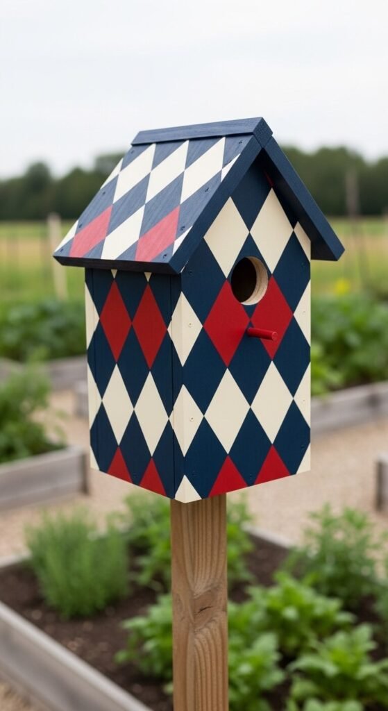 A quilted geometric pattern painted on a plain birdhouse creates a striking folk-art look with almost no artistic skill required. Use painter’s tape to mark out a diamond or checkerboard grid. Paint in alternating colors — navy and cream, or red and white. Peel the tape when dry for crisp, clean lines. This is a great project for kids who can hold a brush. Seal with exterior varnish. The bold pattern stands out beautifully against a green garden or wooden fence. It suits farmhouse, Americana, and Scandinavian garden styles perfectly.