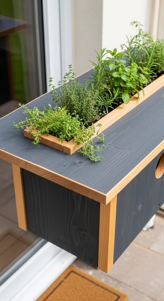 Build a birdhouse with a built-in rooftop planter box by adding a shallow wooden tray to a flat-roofed design. Fill it with low-growing herbs like thyme, creeping rosemary, or mint. The herbs stay compact, require little water, and smell wonderful near a kitchen garden. The weight of the soil helps anchor the house against wind. Paint the body in charcoal, deep navy, or forest green to let the plants steal the show. This project works beautifully mounted on a wall near a back door where you can snip herbs while admiring the birds.