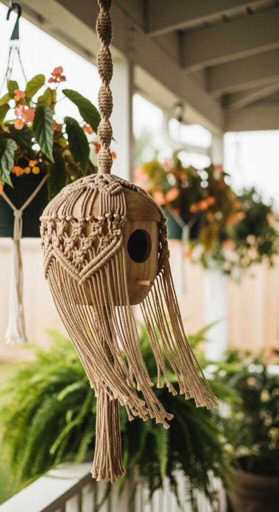 Wrap a plain wooden birdhouse in natural jute twine or macramé knotwork for a boho garden look that feels right at home on a covered porch or pergola. Use basic square knots to create a hanging sleeve around the body of the house, leaving the entrance hole clear. Finish with a fringe bottom. Macramé is surprisingly beginner-friendly — dozens of free YouTube tutorials show basic patterns in under 20 minutes. Hang from a thick braided rope for a finished look. Wrens love enclosed, sheltered hanging houses like this in covered patio spaces.