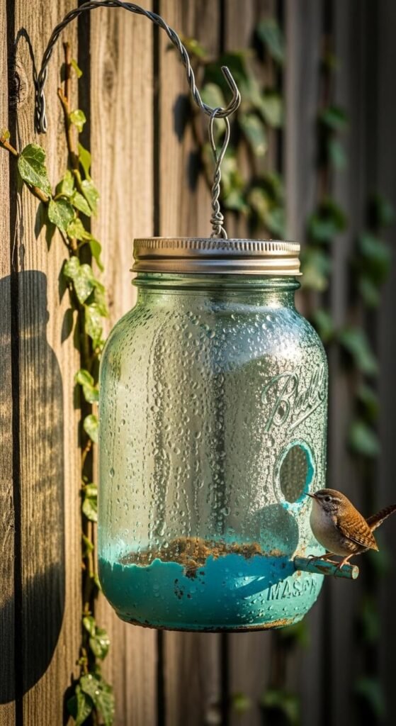 Mason jars make surprisingly charming birdhouses for small species like wrens. Drill a 1-inch hole into the metal lid, flip the jar sideways, and hang it from a strong wire. Paint the outside with weather-resistant outdoor paint in soft greens, blues, or whites. Leave the inside bare so birds feel comfortable nesting. This project costs almost nothing if you already have jars at home. Hang it in a sheltered spot away from direct afternoon sun. Replace the jar each season to keep things clean and safe for returning birds.
