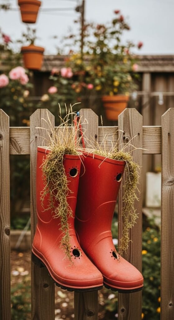 Old rain boots are one of the most fun birdhouse materials you probably already own. Drill an entrance hole near the toe of each boot and hang them upside down on a fence or post. Wrens and chickadees love small enclosed spaces like this. The rubber naturally repels water, making it a surprisingly practical choice. Hang a pair together for a playful look that kids love. Pick boots in bold colors — red, yellow, or green — to add personality to a garden fence. No painting needed. No special tools beyond a drill.
