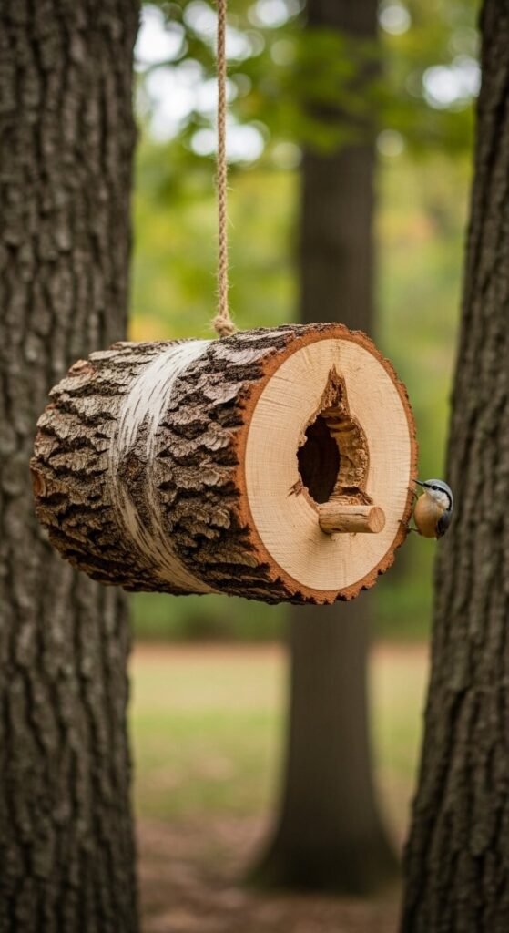 A slice of log or a hollow branch makes one of the most natural-looking birdhouses you can hang in a wooded yard. Look for fallen birch or cedar logs at a local lumber yard or nature preserve. Use a spade bit to hollow out the interior and drill an entrance hole. The rough bark exterior blends right into the tree line. Birds like nuthatches and chickadees are especially drawn to log-style cavities. Hang it with sturdy rope or a metal bracket. Leave the bark on — it acts as natural insulation.