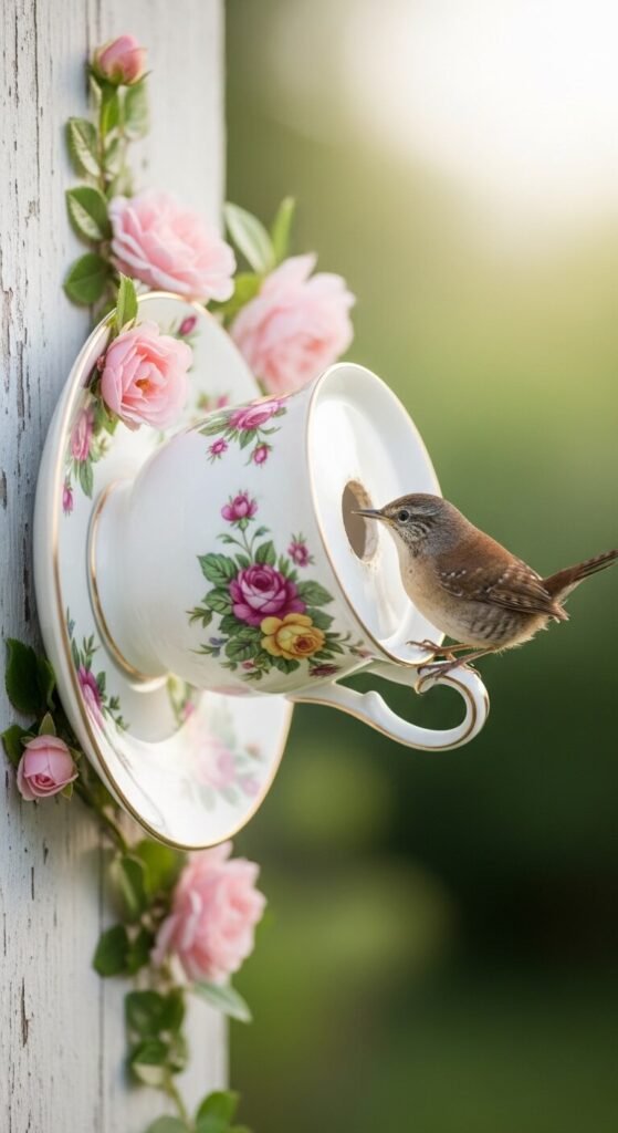 Thrift store teacups and saucers can become the most charming wall-mounted birdhouses in minutes. Glue the cup to the saucer at an angle using waterproof adhesive, drill a small entrance hole, and mount the saucer flat against a fence or wall. This works best for decorative purposes or for very small birds in mild climates. Pick mismatched floral patterns for a cottage-garden feel. A set of three in different sizes hung at varying heights looks beautiful against a white wall. Seal the outside with outdoor Mod Podge to protect against rain.