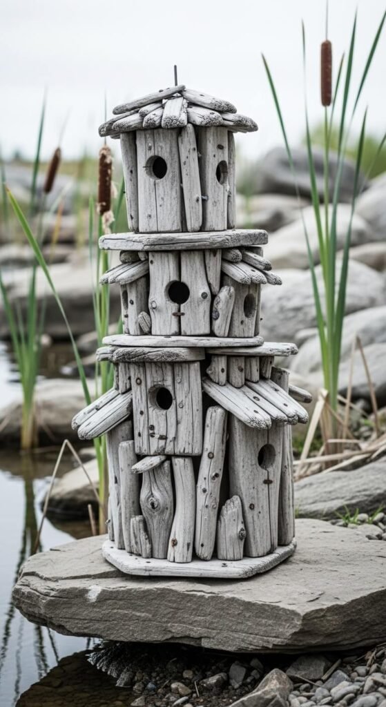 Driftwood gives any birdhouse a coastal, organic look that feels completely at home near water or in a naturalistic garden. Collect pieces of different shapes and sizes from a beach or riverbank — or buy a bag from a craft store for a few dollars. Stack and nail or glue them together into a rough box shape. Leave the gaps slightly open for ventilation. This style suits marsh birds and wrens. No staining or painting needed — the silver-gray tones of driftwood are already beautiful and weather-proof by nature.