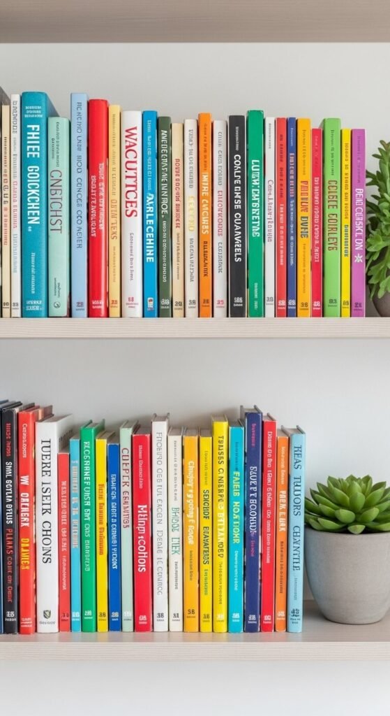 Turn your cookbook collection into art by organizing books by spine color. This creates a rainbow effect that feels playful and organized.
