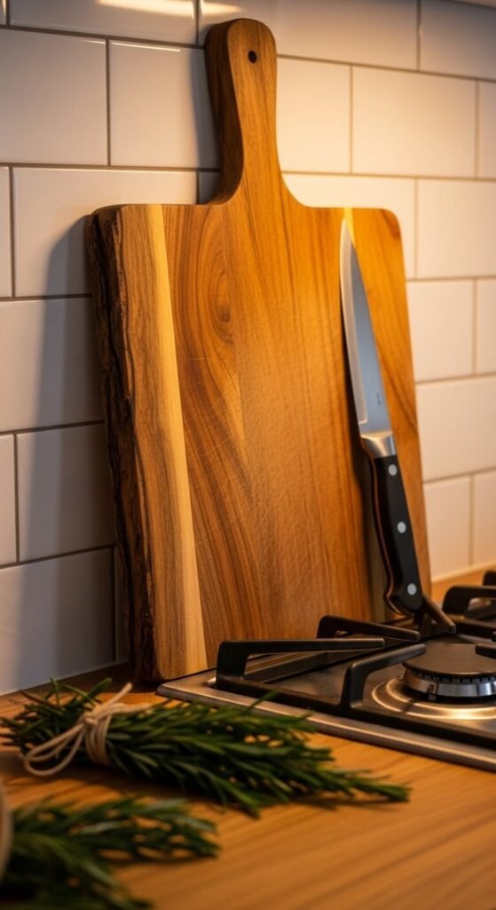 Look for boards with attractive grain patterns at kitchen stores or make your own from reclaimed wood. Sand and oil it properly for food safety. Position it near your prep area so it’s easy to grab for cooking. The vertical display shows off the board’s character while keeping counter space clear. Choose one that’s both functional and attractive enough to earn its spot.