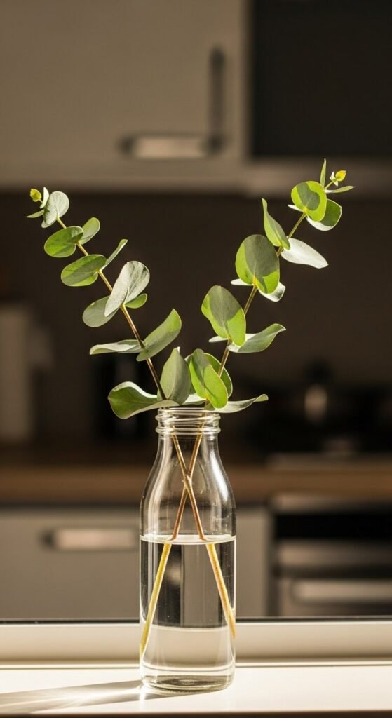 Add single stems of eucalyptus, ferns, or pussy willows in small bottles around your kitchen. These subtle touches bring nature indoors without overwhelming your space.