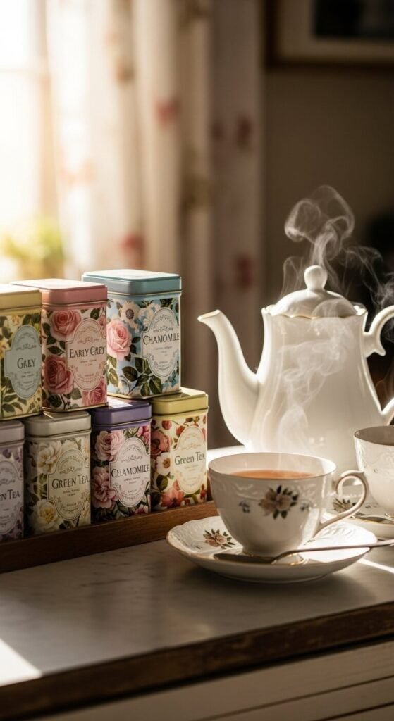 Designate a corner for tea using decorative tins instead of boxes. This turns a daily ritual into something special.