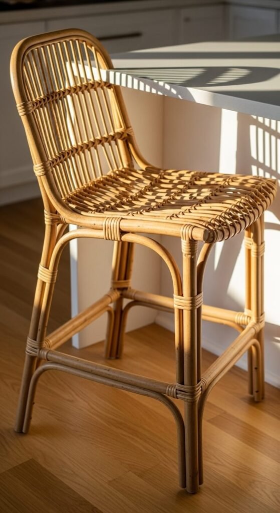 Swap solid stools for woven ones that bring texture and a relaxed coastal vibe. The natural material feels perfect for spring and summer.
