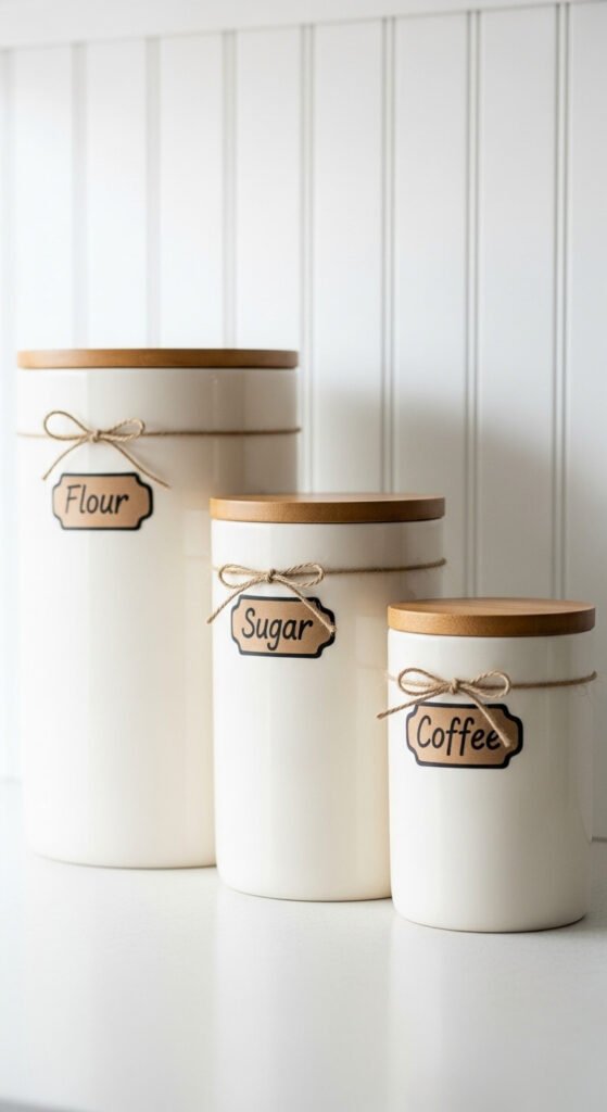 Shop secondhand stores for vintage canisters or buy budget-friendly sets online. Transfer flour, sugar, rice, and coffee into matching containers. Add simple labels using a marker or printable tags. Keep them on your counter if they’re attractive or on open shelving. Clean vessels make your ingredients feel more special and encourage you to bake and cook more often.