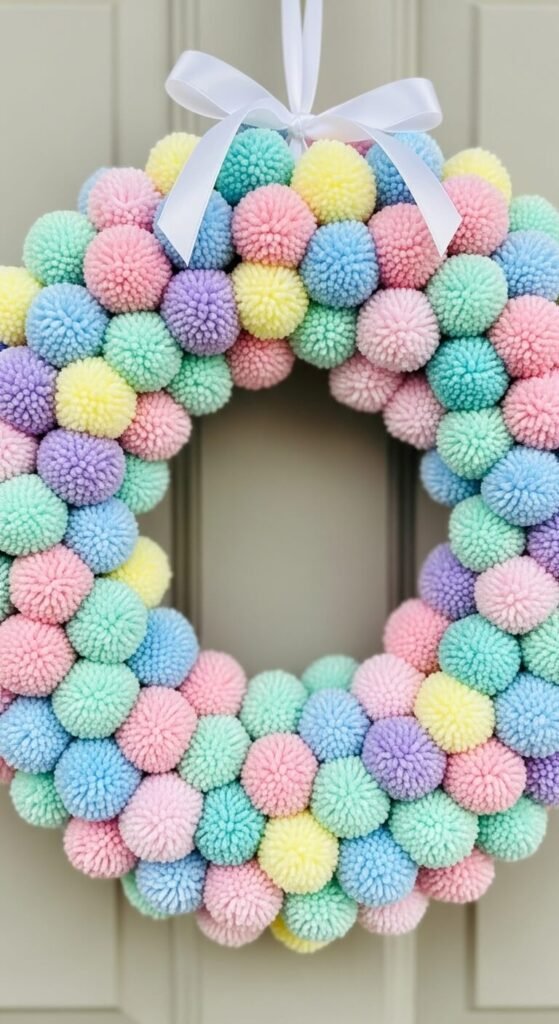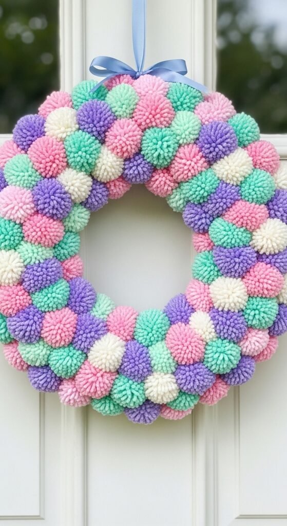 Buy a foam wreath form and hot glue pastel pom-poms all over it. You can make pom-poms with a simple tool or buy them pre-made. Cover the entire surface for a soft, cloud-like look.