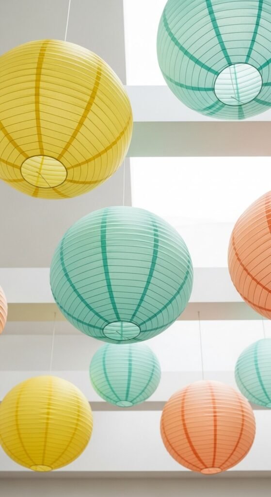 Paper lanterns cost $2-5 each and pack flat for storage. They transform your ceiling into part of the decor. Remove them after Easter or leave them up for spring parties and graduations.