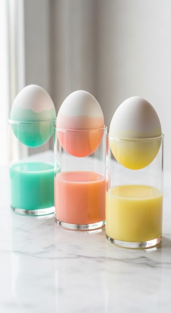 Mix food coloring with water and white vinegar. Dip hard-boiled eggs halfway, let them dry, then flip and dip the other end in a different shade. You’ll get a gorgeous ombre effect. Stack them in tall glass cylinders on your dining table or mantel.