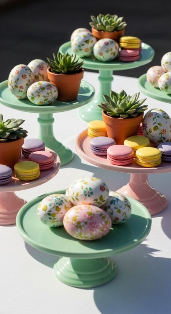 Buy or bake macarons in pastel shades. Arrange them on a tiered stand by color. They serve as both decoration and dessert for your Easter gathering.